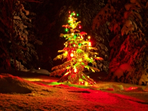 Elävä joulukuusi loi varjojaan ympäröivään kynttiläkuusikkoon.