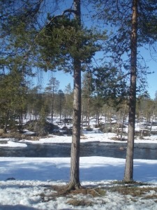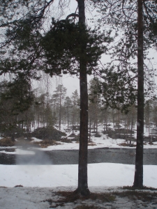 Tuuli nimittäin voimistui nimittäin niin kovaksi, että kotakangas paukahti yhtenä päivänä irti tukikepeistään. Annoimme kodan olla makuuasennossa koko päivän ja junttasimme sen pystyyn vasta iltasella, kun tuuli vähän laantui. Päiväsaikaan iski aikamoinen lumimyräkkä päälle. Meillä oli tuuria, koska astuimme juuri aurinkoisesta kelistä autiokämppään sisälle, kun myräkkä alkoi. Ikkunasta näki, miten lunta pyrytti vaakatasossa. Somempi oli olla suojassa sisällä kuin ulkona riepoteltavana. Tunnin päästä aurinko taas paistoi ja linnut lauloi.